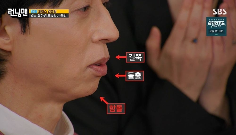 전문가는 유재석의 하관에 대해 “여기가 유니크한 부분이다. 인중이 조금 길고, 입술이 돌출되고 턱이 함몰돼 있다”고 밝혔다. ‘함몰’이란 말에 현장은 난리가 났고, 유재석은 “단어를 좀 순화해 주세요”라고 부탁했다. 전문가는 유재석의 변천사를 보여주며 “30년 동안 굉장히 노력하셨다”라며 “사실 지금이 가장 잘생긴 모습”이라고 덧붙였다.