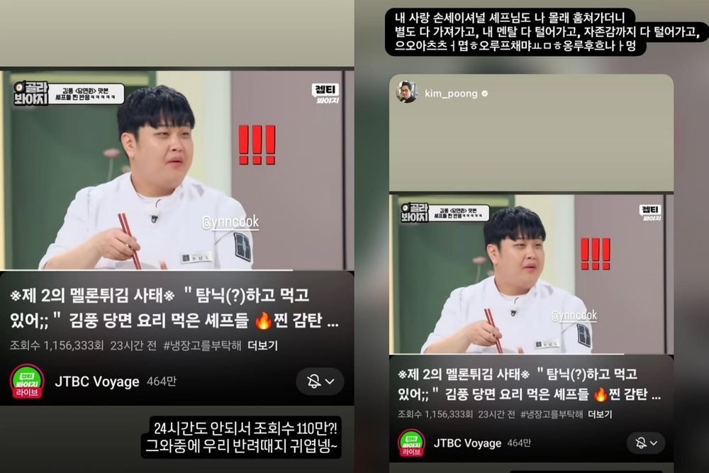 김풍은 26일 자신의 계정에 JTBC ‘냉장고를 부탁해’ 하이라이트 영상 캡처본을 업로드했다. 해당 영상은 ‘제 2의 멜론튀김 사태’라는 제목으로, 김풍의 파격적인 당면 요리를 맛본 셰프들이 경악과 감탄을 동시에 터뜨리는 장면을 담고 있다. 특히 김풍은 영상 속에서 당황스러운 표정을 짓고 있는 윤남노 셰프를 태그하며 장난스러운 도발을 던졌다. 또 24시간도 안 되어 조회수 110만을 돌파한 소식과 함께 “그와중에 우리 반려때지(윤남노 별명) 귀엽넹~”이라는 캡션을 덧붙여 훈훈한 분위기를 연출했다.