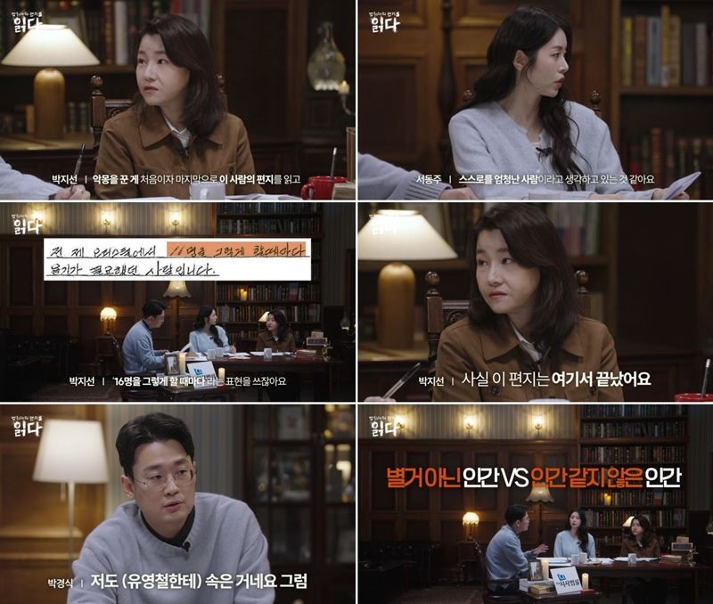 30일 공개되는 ‘읽다’ 5회에서 박지선은 “범죄자를 두려워하지 않는 편인데, 유영철 편지를 읽고 처음이자 마지막으로 악몽을 꿨다”고 밝혀 궁금증을 자아낸다. 박지선은 유영철에 대해 “알려진 살인 피해자만 20명인 희대의 인물”이라고 설명하며, “편지를 읽다 보면 유영철이 원하는 방향으로 교묘하게 말려 들어가는 느낌을 받는다. 사람을 조종하는 데 능한 인물이라, 이런 점 때문에 악몽을 꿨다”고 전한다.