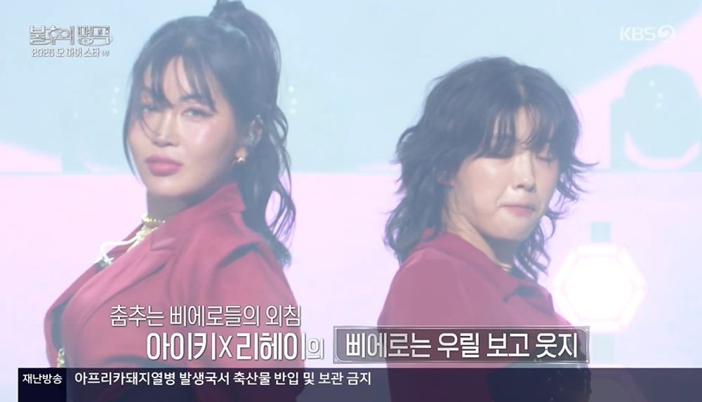 이날 2026 ‘오 마이 스타 특집’ 1부 첫 번째 무대는 아이키와 리헤이가 꾸몄다. 두 사람은 ‘삐에로는 우릴 보고 웃지’로 파워풀한 퍼포먼스와 함께 흔들림 없는 무대를 선보였다. 효진초이는 두 사람을 위해 방청석에서 격한 응원을 보냈다. 두 사람은 고득점인 400점으로 1승을 차지했다.