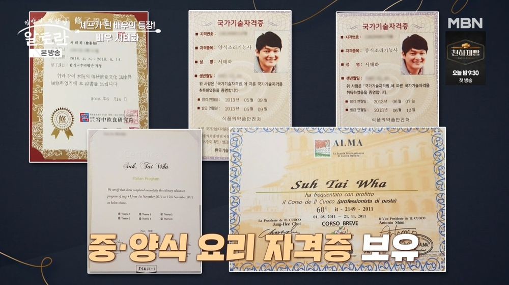 오프닝에서 차유나는 “서태화가 보유한 요리 자격증·수료증만 8개가 넘는다”고 밝혔다. 서태화는 “하다 보니 그렇게 됐다”며 “자격증은 중식, 양식, 파스타 코스 수료한 게 있다. 궁중음식, 육가공 자격증도 있다”고 말했다.