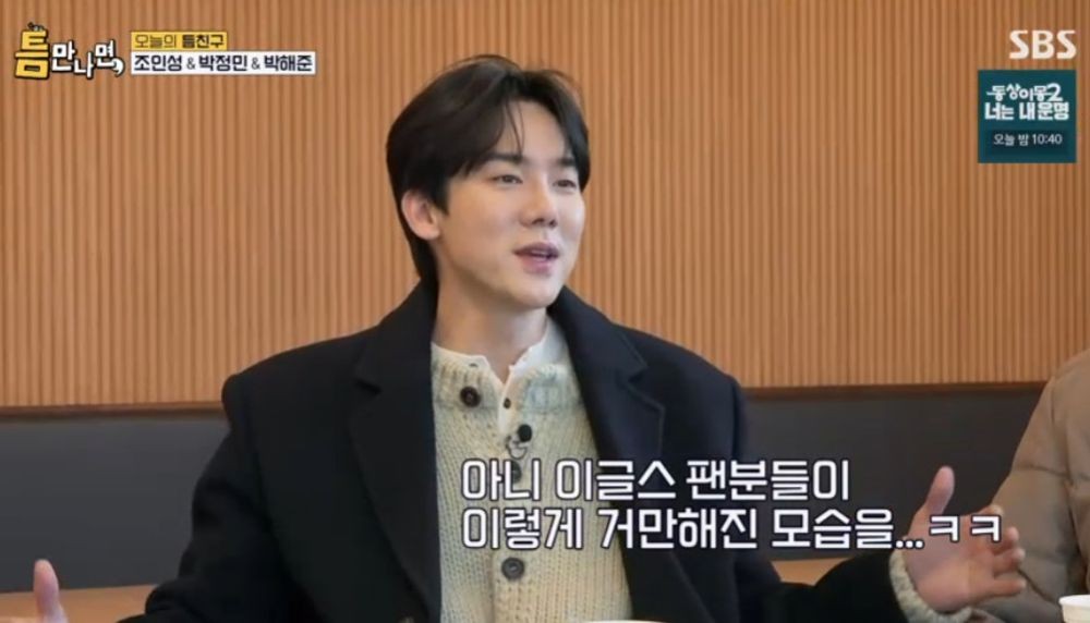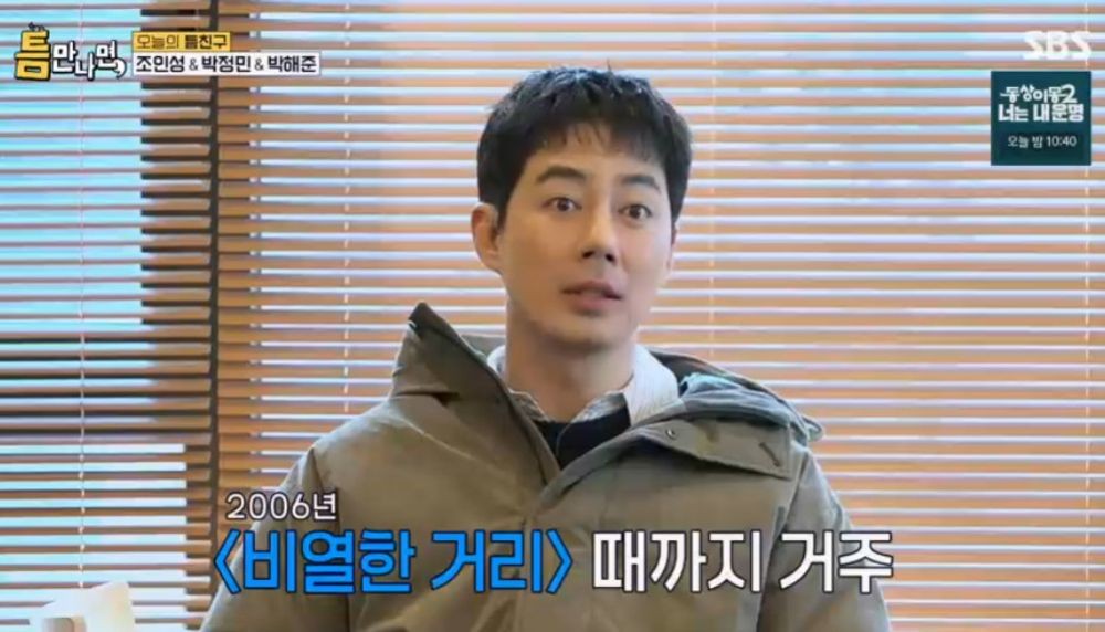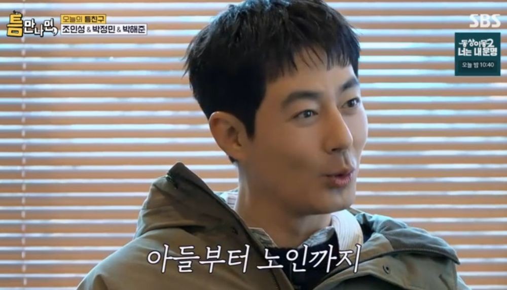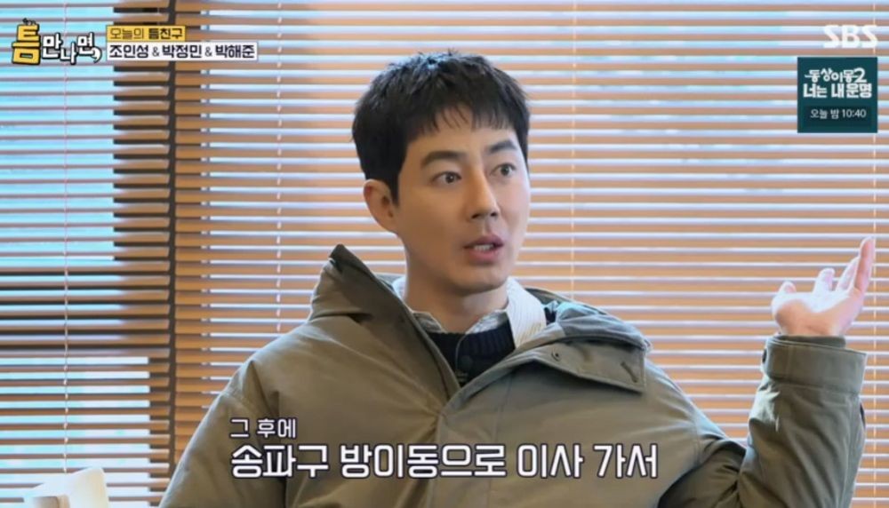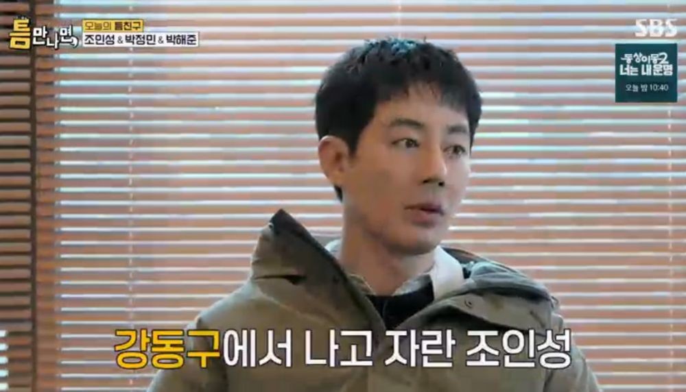 이날 ‘틈만 나면’ 촬영이 진행된 서울 강동구에서 학창시절을 보냈다는 그는 “초, 중, 고등학교를 다 다니고 2006년 ‘비열한 거리’ 이후 송파구 방이동으로 이사를 갔다. 지금은 방이동의 독거노인”이라며 너스레를 떨었다. 이에 박정민이 “강동인들은 강동에 대한 자부심이 굉장하더라”고 하자 조인성은 “그렇다. 우리 강동구에 좋은 학교가 많다”고 뽐냈다.