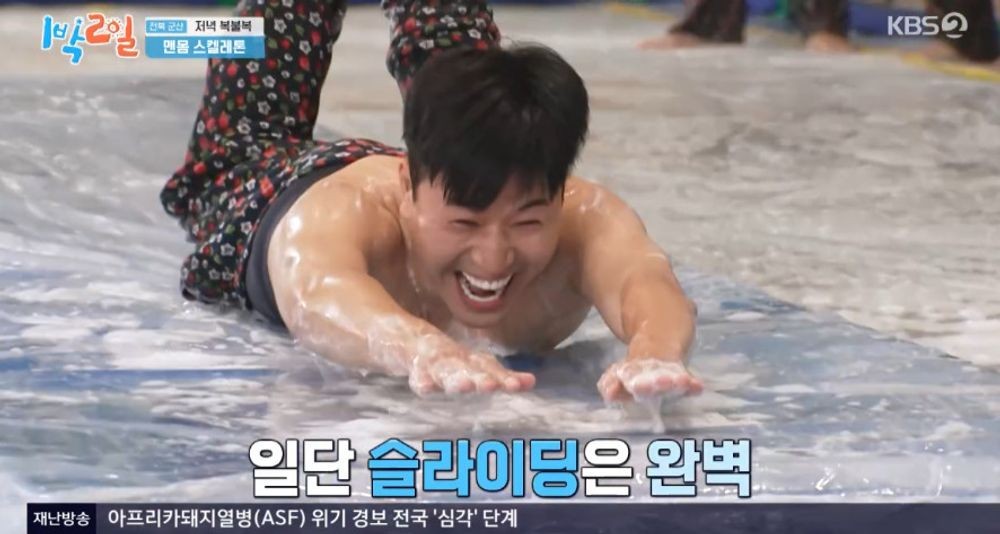 이날 저녁 복불복으로 ‘맨몸 스켈레톤’이 펼쳐진 가운데 김종민은 “죄송한데 옷 벗어도 되겠나. 옷이 거치적거려서 그렇다. 내가 1등을 해야 한다”며 의욕을 보였다.