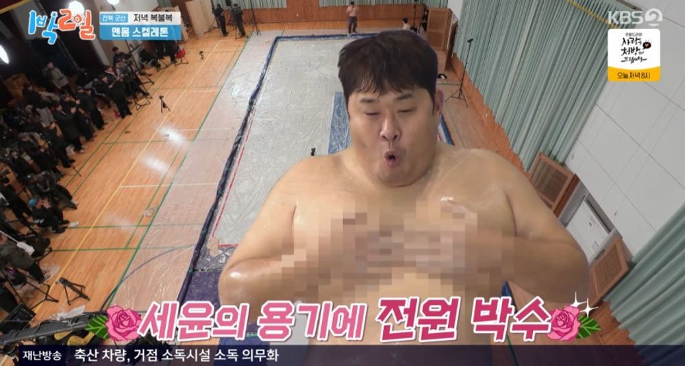 이에 문세윤도 용기를 냈다. 평소 노출을 질색하던 문세윤은 큰 결심 후 우람한 상체를 드러냈다. 모두의 응원 속 문세윤은 김종민을 넘어 우위를 점했다.