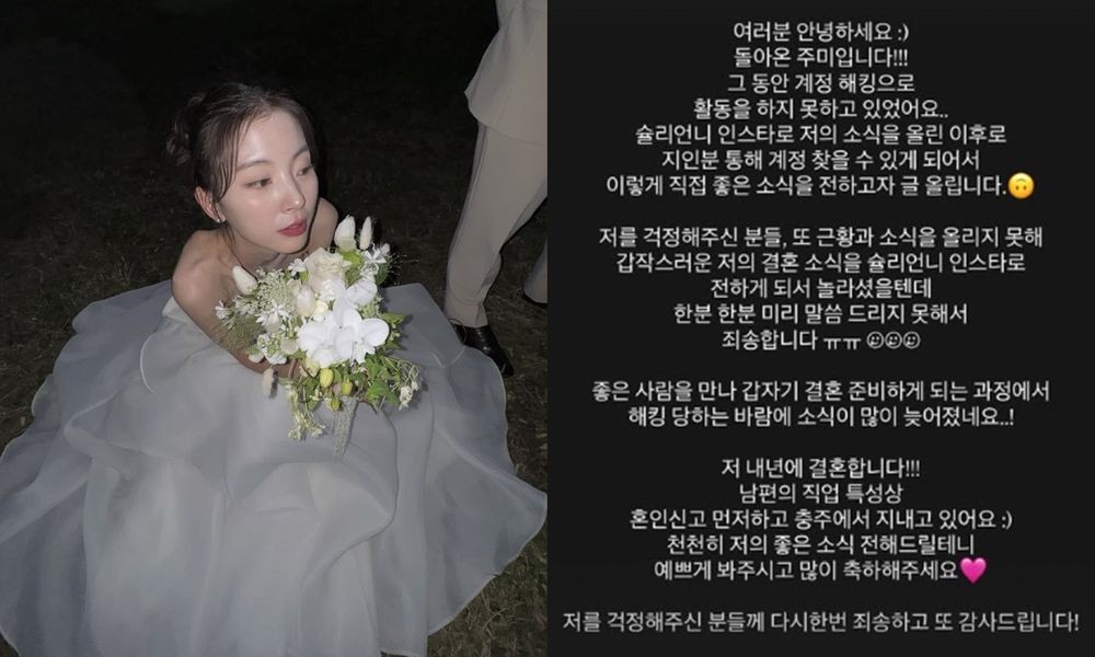 또한 주니는 결혼 소식을 늦게 알리게 된 배경도 솔직하게 밝혔다. 그는 “좋은 사람을 만나 갑자기 결혼을 준비하던 과정에서 해킹을 당해 소식이 늦어졌다. 남편의 직업 특성상 혼인신고를 먼저 하고 충주에서 지내고 있다. 걱정해주신 분들께 죄송하고 감사드린다”라고 덧붙였다.
