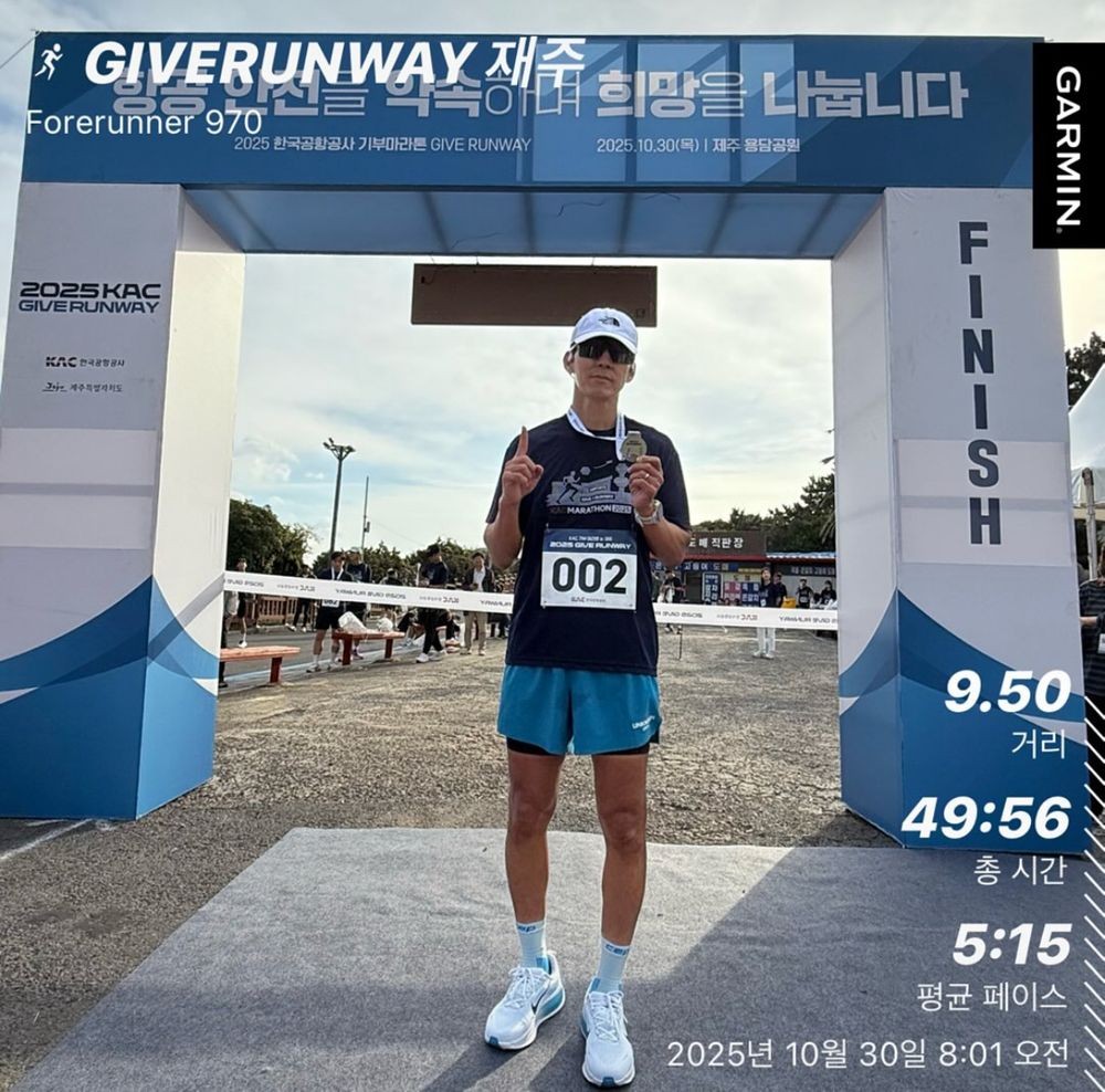 30일 션은 자신의 계정에 “혜영이한테 빵 사러 잠깐 나갔다 온다고 하고 제주도에서 9.5km 기부런 뛰었다”라는 글과 함께 여러 장의 사진을 공개했다.