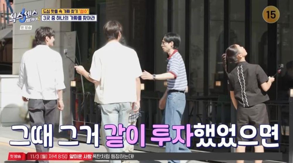 이동 중 성수동 거리를 둘러보던 지석진은 “심지어 동료가 사자고 했었다”라고 재차 토로했다. 이에 유재석은 “내가 옆에서 들었다. 그 친구가 ‘형 이번 주말에 상수 가보실래요?’하더라. 그때 여기 투자 했으면 지금 이거 안 해도 되는데”라고 말했다. 그러자 지석진 역시 “그래. 나 여행 다니고 와이프랑 크루즈 다니고”라며 안타까워 했다.